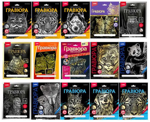 в технике Скретчинг "Животные" АССОРТИ, цветная основа 30х40 см, штихель, 12 шт/уп