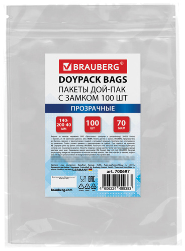 Пакеты фасовочные дой-пак с замком ZIP LOCK прозрачные BRAUBERG