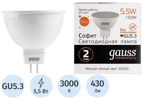 5 Вт GU5.3 MR 3000 К 400 Лм