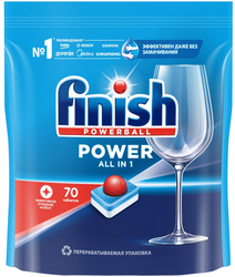 <b>Таблетки для посудомоечных машин Finish Power (70 штук в упаковке) </b> <b>Назначение: </b>Finish Power All in 1 — это удобные в использовании мультифункциональные таблетки для посудомоечной машины. Красный ингредиент таблетки Powerball отмывает посуду до сияющего блеска. Эффективная формула справляется с загрязнениями, пригоревшей пищей и обеспечивает отличный результат каждый раз. <b>Способ применения: </b> не трогайте таблетку мокрыми руками. Не снимайте оболочку с таблетки, она полностью растворяется в процессе мойки. Поместите 1 таблетку в сухой отсек на 1 цикл мойки. Не кладите таблетку в корзину для столовых приборов. Для наилучшего результата выбирайте режим мойки с температурой 50-55 °С или «авто». <b>Меры предосторожности: </b> содержит субтилизин. Может вызывать аллергические реакции. Может причинить вред при проглатывании. При попадании в глаза вызывает выраженное раздражение. Хранить в недоступном для детей месте. При попадании в глаза: осторожно промыть водой в течение нескольких минут. Снять контактные линзы, если Вы ими пользуетесь и, если это легко сделать. Продолжить промывание глаз. Если раздражение глаз не проходит, обратиться к врачу, взяв с собой упаковку продукта или этикетку. Не глотать. При проглатывании обратиться к врачу. Не вызывать рвоту, если это не рекомендовано врачом. При попадании в полость рта, прополоскать рот большим количеством воды, обеспечить доступ свежего воздуха. При попадании на кожу: промыть большим количеством воды. Более полная информация по безопасному обращению химической продукции находится в паспорте безопасности. <b>Состав: </b> 5 % или более, но менее 15%: отбеливающие вещества на основе кислорода, поликарбоксилаты; менее 5%: фосфонаты, неионогенные ПАВ; энзимы, ароматизирующие добавки. <b>Условия хранения: </b>не хранить с несовместимыми материалами, пищевыми продуктами и питьевой водой. Вскрывать непосредственно перед началом использования. Не хранить без оригинальной маркировки. <b>Срок годности: </b>2 года с даты изготовления.