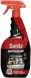 <br><br>Чистящее средство для кухни (жироудалитель) Санита Антижир 0.5 л от жира и нагара спрей<br><br><b>Назначение.</b> Средство предназначено для очищения плит, стеклокерамических плит, кухонной бытовой техники, микроволновых печей, керамических плит, вытяжек, духовых шкафов. Быстро и эффективно удалит жирные пятна, налёт, сложные загрязнения. <br><b>Способ применения.</b> Использовать средство только на охлажденной поверхности, не использовать абразивные губки. Распылить средство на загрязнённую поверхность. Выдержать 5-7 минут, протереть тряпкой или губкой. При необходимости обработку повторить. Не использовать для чистки окрашенных, полированных и лакированных поверхностей, а также изделий из нержавеющей стали и алюминия. <br><b>Меры предосторожности.</b> Осторожно! При попадании в глаза вызывает раздражение! При попадании в глаза — промыть большим количеством воды. При необходимости обратиться к врачу! Условия хранения.Хранить в недоступных для детей местах, отдельно от пищевых продуктов. Рекомендуется использовать резиновые перчатки. Не смешивать с другими средствами. <br><b>Состав.</b> 5%-15% растворитель, <5% НПАВ, <5%: АПАВ, d-лимонен, соль ЭДТА, ароматизирующий компонент. Условия хранения Хранить в сухом прохладном месте. Предохранять от попадания прямых солнечных лучей. <br><b>Срок годности.</b> 24 месяца с даты изготовления (дату изготовления см. на упаковке).