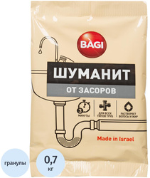 <p>Средство для прочистки труб Bagi Шуманит гранулы 0.07 кг<br><br><b>Назначение</b> <br>Гранулы для прочистки труб, изготовленных из разных материалов, от любых видов загрязнений. Причинами засоров становятся остатки пищи, волосы, известковые отложения, бумага и пр. Регулярное использование гранул позволит предотвратить засор. Если же он появится, применение средства поможет его растворить и избежать необходимости механической прочистки. Данное экспресс-средство способно всего за несколько минут справиться с возникшим засором.<br><b>Способ применения</b> <br>Всыпать порционное средство в раковину или ванну, добавить по инструкции воды, подождать 3 минуты, пролить большим количеством воды. При неполном удалении засора операцию повторить.<br><b>Меры предосторожности</b> <br>Беречь от детей. Использовать строго по назначению. При любом дискомфорте в результате применения обратиться к врачу.<br><b>Состав</b> <br>Гидроксид натрия >30%, вещество, предотвращающее спекание.<br>Неприменимо.<br><b>Условия хранения</b> <br>Хранить в сухом недоступном для детей месте. Не использовать совместно с другими средствами.<br><b>Срок годности</b> <br>36 месяцев.</p>