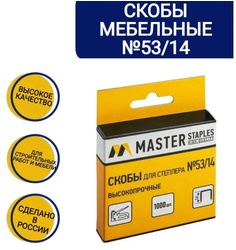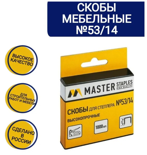 Скобы к степлеру типа 53, предназначенные для крепления различных материалов (ткань, обивка, холст) к поверхностям из дерева, ДСП и пластика. Изделия изготовлены из оцинкованной стали высокого качества. Размер скобы — 14 мм. В картонной упаковке 1000 штук.