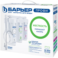 1 ступень – БАРЬЕР "ПРОФИ Механика 5 мкм". Удаляет любые механические примеси более 5 мкм – песок, пластик, ржавчину и другие элементы. 2 ступень – БАРЬЕР "ПРОФИ Смягчение". Снижает карбонатную жесткость, из-за которой образуется накипь в чайнике. Ресурс – до 6 месяцев, однако картридж может быть подвергнут регенерации в домашних условиях с помощью простой поваренной НЕйодированной соли (не более 8 раз). 3 ступень – БАРЬЕР "ПРОФИ ПостКарбон". Осуществляет финишную очистку и кондиционирование, устраняет неприятные привкусы, хлор и тяжелые металлы.