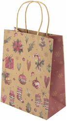 Подарочный пакет новогодний изготовлен из крафт-бумаги, снабжен бумажными ручками. Размер – 18x10x23 см. Пакет украшен изображениями новогодних атрибутов.