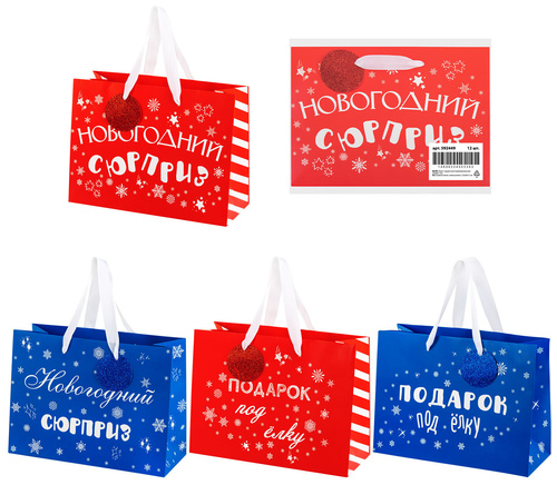 Подарочный пакет новогодний изготовлен из ламинированного мелованного картона, снабжен ленточными ручками из полиэстера. К каждому пакету прикреплен круглый хэнгтэг, на обратной стороне которого можно оставить свои теплые пожелания, сделав подарок еще ближе и трогательнее. А лицевая сторона хэнгтэга покрыта красным и синим глиттером, что делает его ярким завершающим акцентом. Каждый пакет украшен очаровательными надписями и рисунками в новогодней тематике. Размер – 27х11х20 см.