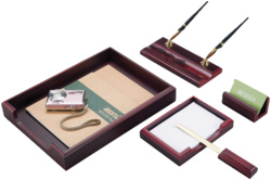 Предметы набора изготовлены из дерева, цвет - красное дерево. В набор входят: Лоток для бумаг. Подставка для ручек (2 шариковые ручки в комплекте). Подставка для бумажного блока. Подставка для визиток. Нож для вскрытия конвертов.