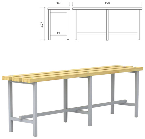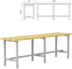 Каркас из металлической трубы серого цвета прямоугольного сечения размером 25х25 мм. Покрытие - полимерное, порошковое. Сиденье - доска из сосны толщиной 30 мм, покрыто прозрачным лаком с антисептиком. Размеры (ШхГхВ) - 1500х340х475 мм. Фурнитура и инструкция по сборке - в комплекте. Поставляется в разобранном виде.