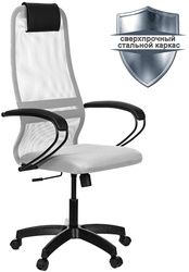 Спинка высокая, эргономичной формы с ярко выраженной поясничной поддержкой. Спинка имеет сверхпрочный стальной каркас с износостойким полимерным покрытием черного цвета. Спинка снабжена мягким комфортным подголовником. Сиденье средней жесткости, объемное на столярном каркасе. Обивка из износоустойчивой "дышащей" сетчатой ткани. Подлокотники стальные классические, с мягкими накладками из экокожи. Прочное пластиковое пятилучие. Модель оснащена механизмом качания "Top-Gun" с регулировкой под вес и возможностью фиксации в рабочем положении.