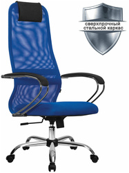 Спинка высокая, эргономичной формы с ярко выраженной поясничной поддержкой. Спинка имеет сверхпрочный стальной каркас с износостойким полимерным покрытием черного цвета. Спинка снабжена мягким комфортным подголовником. Сиденье средней жесткости, объемное на столярном каркасе. Обивка из износоустойчивой "дышащей" сетчатой ткани. Подлокотники стальные классические покрытые зеркальным хромом, с мягкими накладками из экокожи. Пятилучие – металлическое хромированное. Модель оснащена механизмом качания "Top-Gun" с регулировкой под вес и возможностью фиксации в рабочем положении.
