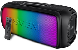 Выходная мощность (RMS) – 100 (2х50) Вт. Режим воспроизведения – стерео. Частотный диапазон – 40-22000 Гц. Диапазон частот тюнера – 87.5-108 МГц. Размеры динамиков – ВЧ: 58 мм, НЧ: 134 мм. Беспроводная передача сигнала по Bluetooth. Воспроизведение музыки с носителей памяти формата USB, microSD. Источник питания – литий-ионный aккумулятор: 7.4 В, 5400 мАч (39.96 Втч). USB: DC 5 V. Время работы (при 30% громкости, базовые настройки эквалайзера, в режиме Bluetooth, без подсветки, при комнатной температуре): 18 часов. Время полной зарядки (может меняться в зависимости от используемого зарядного устройства и кабеля): 5 часов. Номинальный ток потребления – 0.4 А. Тип соединения – Bluetooth, проводной (3.5 mm jack). Совместимость в режиме TWS – SVEN PS-860. Размеры изделия (ШхВхГ) – 502х235х226 мм. Вес – 5,7 кг. Цвет – черный.