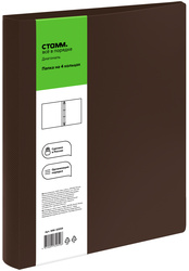 Папка на четырёх кольцах «СТАММ» серии «Диагональ» предназначена для сшивания и хранения документов формата А4. Внешняя сторона папки дополнена фактурным тиснением «Диагональ», которое защищает изделие от загрязнений и повреждений. Папка изготовлена из качественного полипропилена толщиной 700 мкм. Размер папки — 310250 мм. Кольцевой механизм, состоящий из четырёх колец диаметром 25 мм, надёжно удерживает документы. Ширина корешка — 40 мм, что позволяет вмещать до 250 листов. Папка подходит для хранения как перфорированных документов, так и папок-вкладышей с универсальной перфорацией. Папка упакована в индивидуальный пакет.<br/>• Размер: 310250 мм;<br/>• Толщина материала: 700 мкм;<br/>• Формат: А4;<br/>• Вместимость в листах: до 250 листов;<br/>• Цвет: шоколад;<br/>• Ширина корешка: 40 мм.