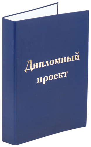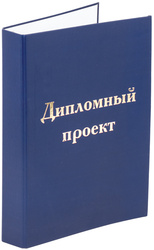 Корешок папки позволяет вмещать до 150 листов. Для удобства сшивки листов имеет 3 отверстия и шнурок. Книжная обложка с матовой ламинацией защитит содержимое и придаст работе аккуратный вид. Папка формата А4 (215х305 мм) выполнена в глубоком синем цвете и имеет тиснение фольгой на лицевой стороне в виде надписи "Дипломный проект".