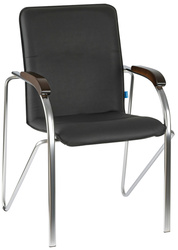 Универсальность модели стула для посетителей Helmi HL-F03 «Самба» в ее безупречной сочетаемости с самыми различными интерьерными решениями. Мягкое основание стула с монолитным фанерным каркасом на хромированной металлической раме обеспечивает комфорт посетителям и сотрудникам. Модель выполнена из экокожи черного цвета. Набивка – высокоупругий эластичный поролон. Подлокотники с деревянными накладками классического цвета «орех» добавляют особого лоска офисному стулу. Поставляются по 1 штуке в коробке.<br/>• Материал обивки: экокожа;<br/>• Материал рамы: хромированный металл;<br/>• Цвет: черный.