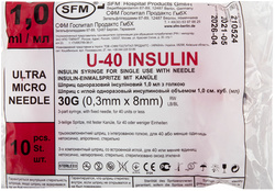 1 мл, комплект 10 шт., в пакете, U-40 игла несъемная 0,3х8 мм - 30G, 10 шт/уп