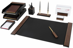 Набор состоит из 8 предметов: - Двойной лоток для бумаг формата А4; - Коврик для письма (размер 66,5х43,5 см); - Подставка для ручек (2 шариковые ручки с синими чернилами в комплекте); - Стакан-подставка для письменных принадлежностей; - Подставка для бумажного блока; - Подставка для визиток; - Подставка для писем; - Нож для вскрытия конвертов.
