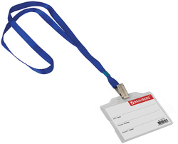 Бейдж на текстильной синей ленте используется для размещения именных карточек, пропусков, пластиковых карт. Карман из твердого прочного пластика гарантирует долгий срок службы. Идеально подойдет для чувствительных к механическим повреждениям магнитных карт, пропусков и удостоверений личности. Закрепляется лентой 45 см. Размер вкладыша 85х55 мм.
