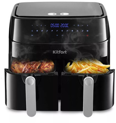 Во избежание случайного выпадения корзины из поддона, на ручке корзины имеется специальная кнопка для её извлечения. Модель КТ-2250 имеет оригинальную форму и лаконичный дизайн. Благодаря особой форме корпуса аэрогриль не займёт много места на кухне.