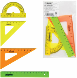 В набор входит: - Линейка со шкалой 16 см; - Угольник с углами 30°/60° и шкалой 10 см; - Угольник с углами 45°/45° и шкалой 7 см; - Транспортир 180° и шкалой 8 см.