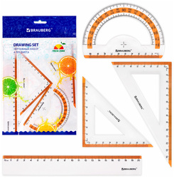 Набор чертежный BRAUBERG "FRESH ZONE" изготовлен из прочного прозрачного пластика со шкалой оранжевого цвета. Поставляется в пластиковом пакете с европодвесом.