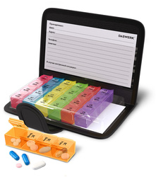 Таблетница представляет собой 7 съемных ежедневных контейнеров, каждый из которых разделен на 4 отделения: утро, день, вечер, ночь. Это позволяет носить с собой как всю таблетницу в удобном и стильном чехле с застежкой, так и отдельные, более компактные, контейнеры на один день. Дома, на работе, в путешествии - упорядоченный прием лекарств и витаминов станет проще с таблетницей-органайзером.