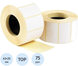 Термоэтикетки 43×25 мм ТОП 40 мм диаметр втулки (75 рулонов по 1000 этикеток)<br><br>Термоэтикетки размером 43×25 мм без печати белого цвета изготовлены из материала Thermal TOP (ТОП) ведущих производителей. Рулон со втулкой диаметром 40 мм содержит 1000 плюс-минус 5 этикеток. Рулоны упакованы в гофрокороба по 75 штук для удобства транспортировки. Самоклеящиеся термоэтикетки применяются для нанесения веса, штрихкодов, цен и другой информации, маркировки товаров недлительного хранения. Потенциальные потребители — супермаркеты, производство, центры техобслуживания кассовых аппаратов, снабжающие компании, компании по поставке упаковочных материалов, предприятия, занимающиеся фасовкой продукции и т. д.<br><br>Термоэтикетки предназначены для печати на термопринтерах в режиме прямой термопечати (Direct Termal, печать с помощью термоголовки).