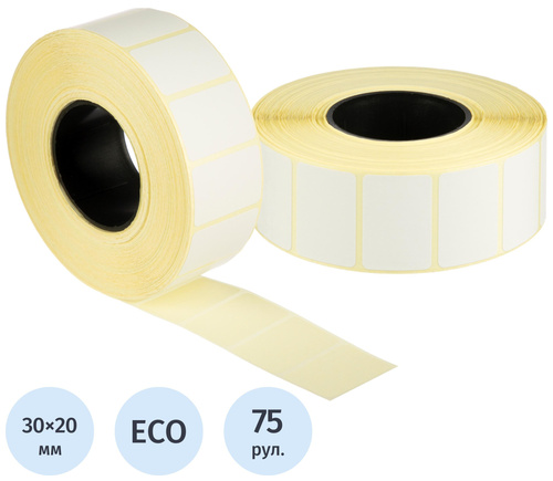 Термоэтикетки 30×20 мм ЭКО 40 мм диаметр втулки (75 рулонов по 2000 этикеток)<br><br>Термоэтикетки без печати белого цвета изготовлены из материала Thermal ECO (ЭКО). Рулон с втулкой диаметром 40 мм содержит 2000 плюс-минус 5 этикеток. Самоклеящиеся термоэтикетки применяются для нанесения веса, штрихкодов, цен и другой информации, маркировки товаров недлительного хранения. Потенциальные потребители — супермаркеты, производство, центры техобслуживания кассовых аппаратов, снабжающие компании, компании по поставке упаковочных материалов, предприятия, занимающиеся фасовкой продукции и т. д. Не рекомендуется использовать для маркировки «сложных» поверхностей (камень, металл и др.)<br><br>Термоэтикетки предназначены для печати на термопринтерах в режиме прямой термопечати (Direct Termal, печать с помощью термоголовки).