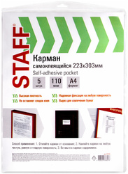 Выполнены из прочного ПВХ плотностью 110 микрон, имеют матовую фактуру и прочный шов. Клейкий прозрачный слой позволяет надежно разместить карманы на любых гладких поверхностях, а при переклеивании не оставляет следов. Для удобства извлечения бумаг на каждом кармане имеется специальный вырез. Размер карманов - 223х303 мм. В комплект входят 5 шт.