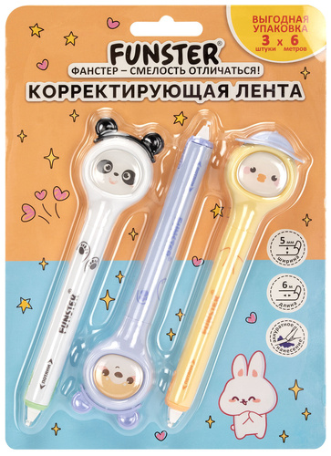 Серия корректирующих лент FUNSTER представлена в ярких и милых цветовых сочетаниях. Её компактный размер и удобная форма позволяют легко хранить ленту в пенале или подставке для канцелярских принадлежностей, имеет выдвижной надежный колпачок, который обезопасит ленту от повреждений. Общая длина ленты составляет 6 м, а ширина – 5 мм. Поставляется в блистере с европодвесом.