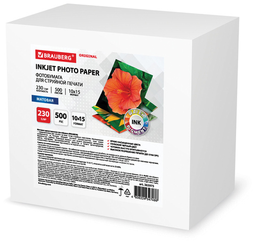 Имеет формат 10х15 см и плотность 230 г/м2, что исключает просвечивание изображения. Отлично подходит для печати черно-белых изображений. Гладкая поверхность обеспечивает превосходное качество, а особый состав - идеальную цветопередачу. Печать возможна водорастворимыми и пигментными чернилами. Поставляется по 500 листов в картонной упаковке.