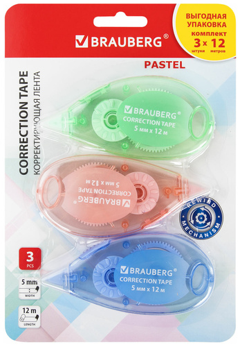 Выгодный формат упаковки – набор из 3 штук! Нежный дизайн корпуса представлен в 3-х пастельных цветах: розовом, голубом и зеленом. Общая длина корректирующей ленты – 12 м, ширина – 5 мм.