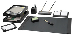 В набор входит 8 универсальных предметов: - Коврик для письма (размер – 60х42 см) - Двойной лоток (для бумаг формата А4); - Подставка для ручек (2 шариковые ручки в комплекте); - Стакан-подставка для письменных принадлежностей и канцелярских мелочей; - Нож для вскрытия конвертов; - Подставка под листы для записей (листы в комплекте); - Подставка под визитки; - Подставка для перекидного календаря.
