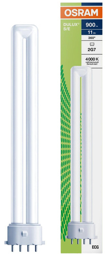 - Компактная люминесцентная лампа неинтегрированная Osram Dulux S мощностью 11 Вт со штырьковым одиночным цоколем 2G7 и однооборотной колбой. Напряжения 91 В применимо конкретно к лампе при работе через пуско-регулировочное устройство